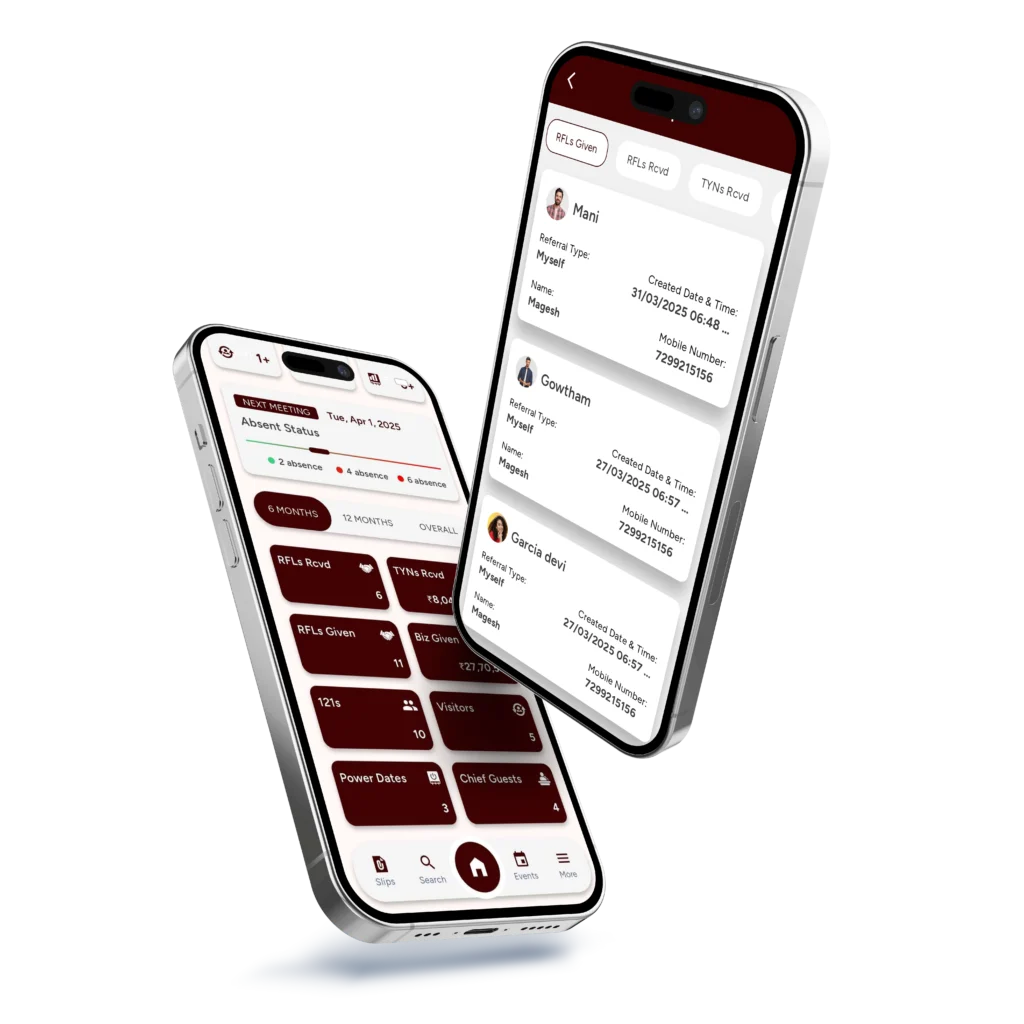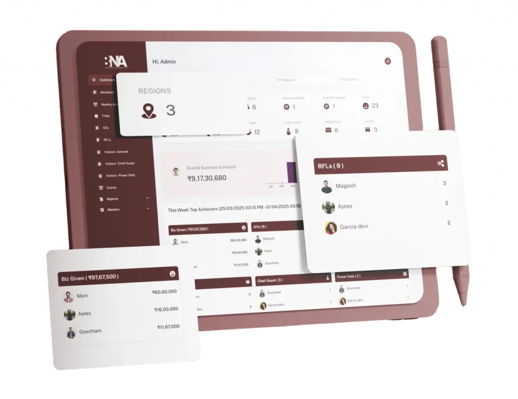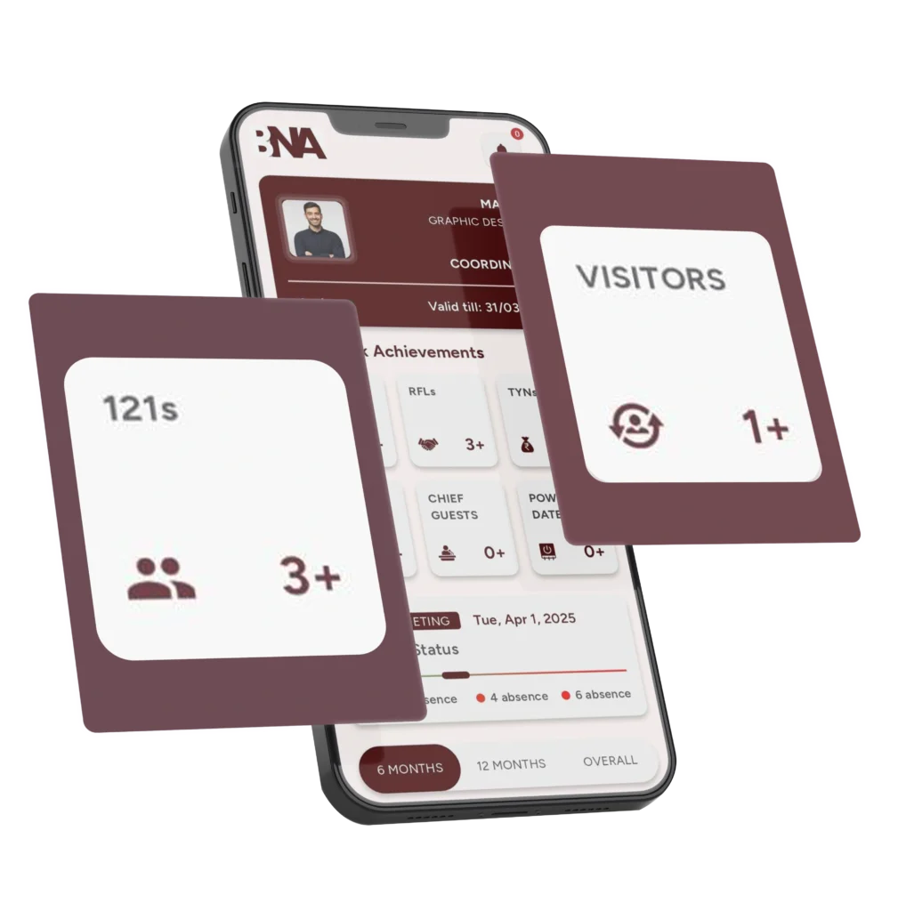 - Record and display points for 121s, referrals, weekly meetings, TYNs, visitors, chief guests, power dates, and inductions.