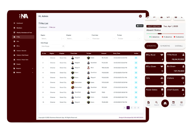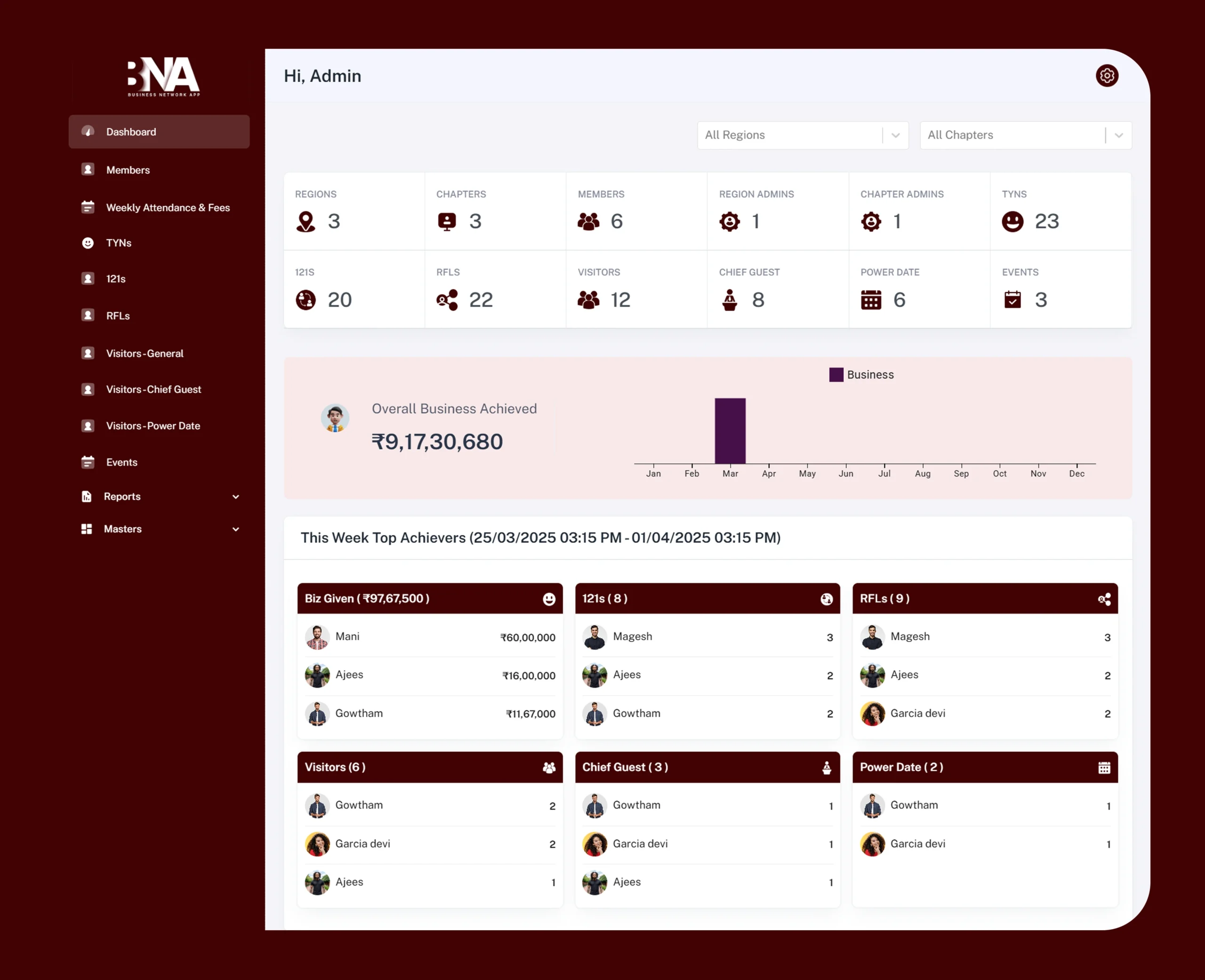 - Record and display points for 121s, referrals, weekly meetings, TYNs, visitors, chief guests, power dates, and inductions.